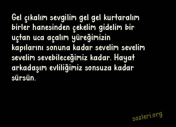 Gel çıkalım sevgilim gel gel kurtaralım birler hanesinden çekelim gidelim bir uçtan uca açalım yüreğimizin kapılarını sonuna kadar sevelim sevelim sevelim sevebileceğimiz kadar. Hayat arkadaşım evliliğimiz sonsuza kadar sürsün. ( Evlilik Yıldönümü )