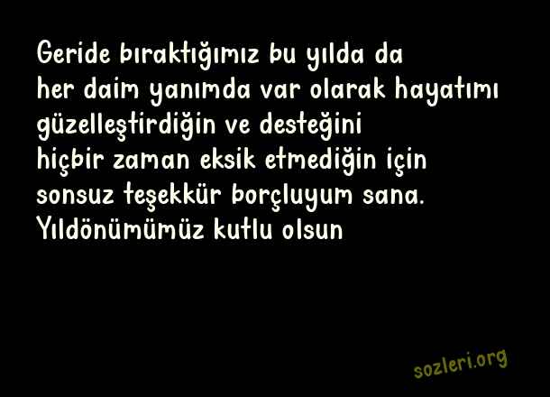 Geride bıraktığımız bu yılda da her daim yanımda var olarak hayatımı güzelleştirdiğin ve desteğini hiçbir zaman eksik etmediğin için sonsuz teşekkür borçluyum sana. Yıldönümümüz kutlu olsun… ( Yıldönümü )