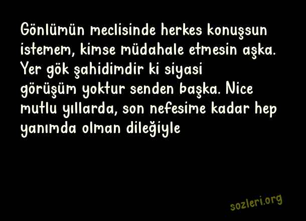 Gönlümün meclisinde herkes konuşsun istemem, kimse müdahale etmesin aşka. Yer gök şahidimdir ki siyasi görüşüm yoktur senden başka. Nice mutlu yıllarda, son nefesime kadar hep yanımda olman dileğiyle… ( Evlilik Yıldönümü )