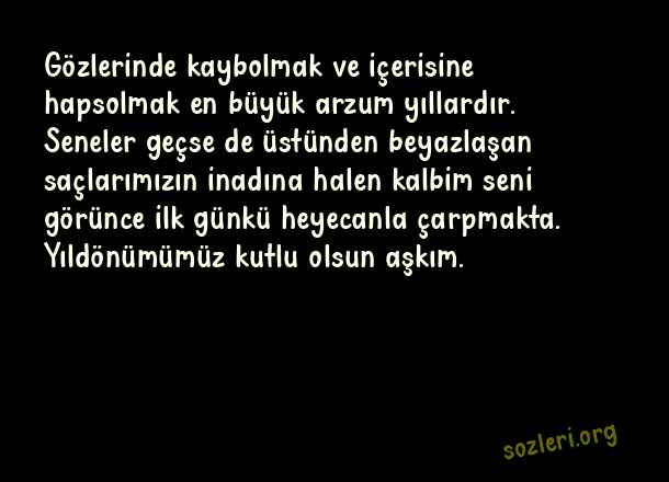 Gözlerinde kaybolmak ve içerisine hapsolmak en büyük arzum yıllardır. Seneler geçse de üstünden beyazlaşan saçlarımızın inadına halen kalbim seni görünce ilk günkü heyecanla çarpmakta. Yıldönümümüz kutlu olsun aşkım. ( Yıldönümü )