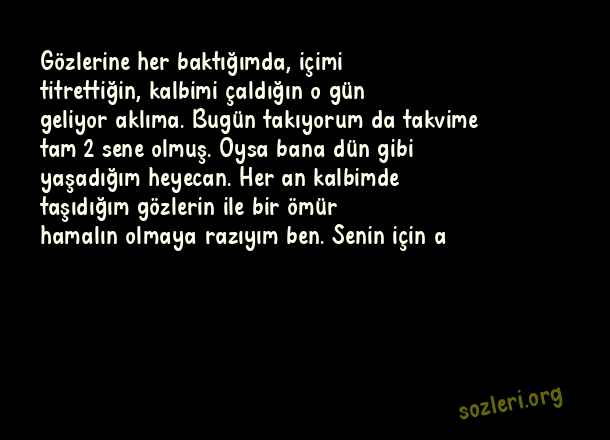 Gözlerine her baktığımda, içimi titrettiğin, kalbimi çaldığın o gün geliyor aklıma. Bugün takıyorum da takvime tam 2 sene olmuş. Oysa bana dün gibi yaşadığım heyecan. Her an kalbimde taşıdığım gözlerin ile bir ömür hamalın olmaya razıyım ben. Senin için a ( Sevgiliye Yıldönümü )