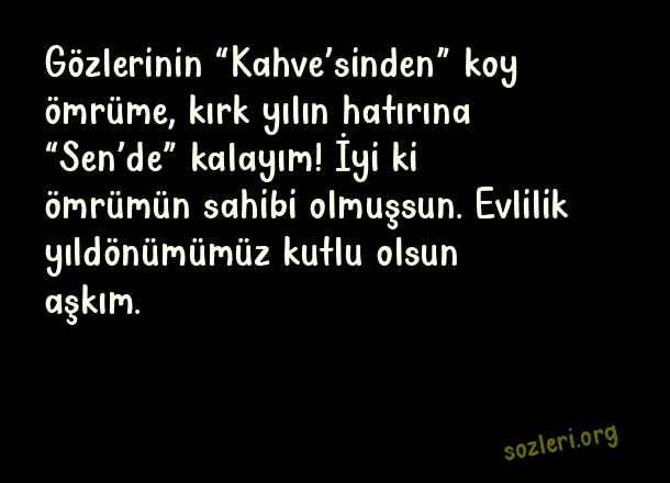Gözlerinin “Kahve’sinden” koy ömrüme, kırk yılın hatırına “Sen’de” kalayım! İyi ki ömrümün sahibi olmuşsun. Evlilik yıldönümümüz kutlu olsun aşkım. ( Yıldönümü )