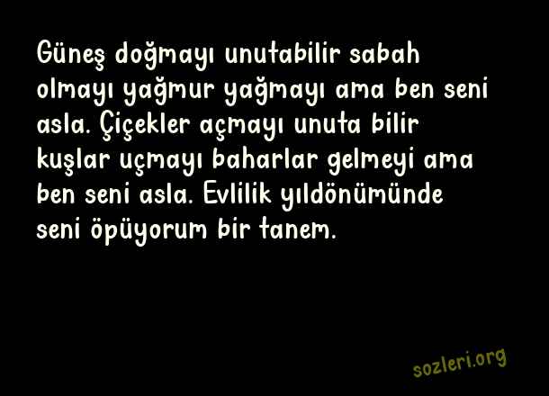 Güneş doğmayı unutabilir sabah olmayı yağmur yağmayı ama ben seni asla. Çiçekler açmayı unuta bilir kuşlar uçmayı baharlar gelmeyi ama ben seni asla. Evlilik yıldönümünde seni öpüyorum bir tanem. ( Evlilik Yıldönümü )