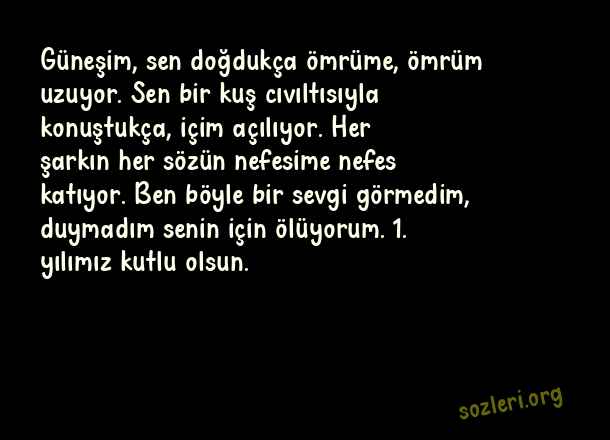 Güneşim, sen doğdukça ömrüme, ömrüm uzuyor. Sen bir kuş cıvıltısıyla konuştukça, içim açılıyor. Her şarkın her sözün nefesime nefes katıyor. Ben böyle bir sevgi görmedim, duymadım senin için ölüyorum. 1. yılımız kutlu olsun. ( Sevgiliye Yıldönümü )