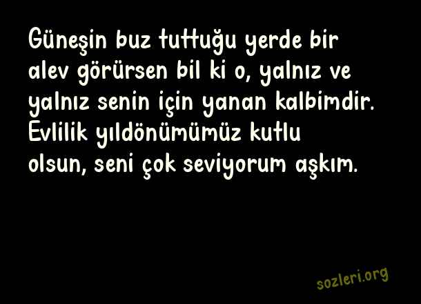 Güneşin buz tuttuğu yerde bir alev görürsen bil ki o, yalnız ve yalnız senin için yanan kalbimdir. Evlilik yıldönümümüz kutlu olsun, seni çok seviyorum aşkım. ( Evlilik Yıldönümü )
