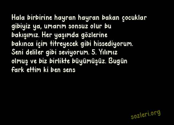 Hala birbirine hayran hayran bakan çocuklar gibiyiz ya, umarım sonsuz olur bu bakışımız. Her yaşımda gözlerine bakınca içim titreyecek gibi hissediyorum. Seni deliler gibi seviyorum. 5. Yılımız olmuş ve biz birlikte büyümüşüz. Bugün fark ettim ki ben sens ( Sevgiliye Yıldönümü )