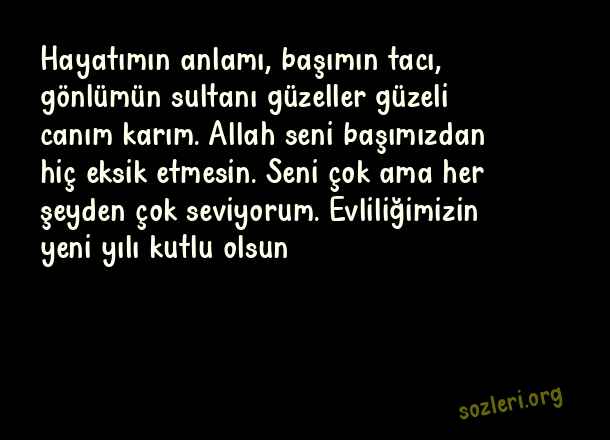 Hayatımın anlamı, başımın tacı, gönlümün sultanı güzeller güzeli canım karım. Allah seni başımızdan hiç eksik etmesin. Seni çok ama her şeyden çok seviyorum. Evliliğimizin yeni yılı kutlu olsun… ( Evlilik Yıldönümü )