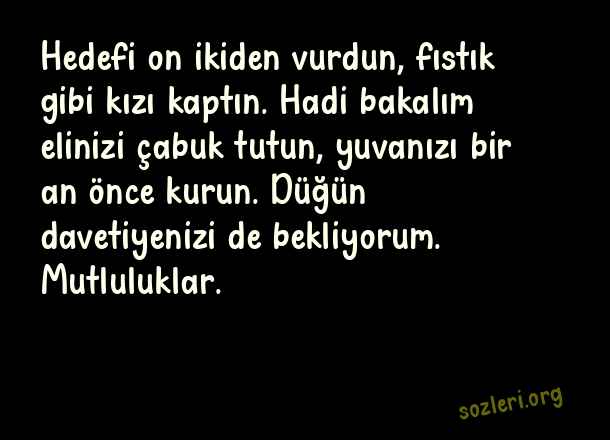 Hedefi on ikiden vurdun, fıstık gibi kızı kaptın. Hadi bakalım elinizi çabuk tutun, yuvanızı bir an önce kurun. Düğün davetiyenizi de bekliyorum. Mutluluklar. ( Eşe Yıldönümü )