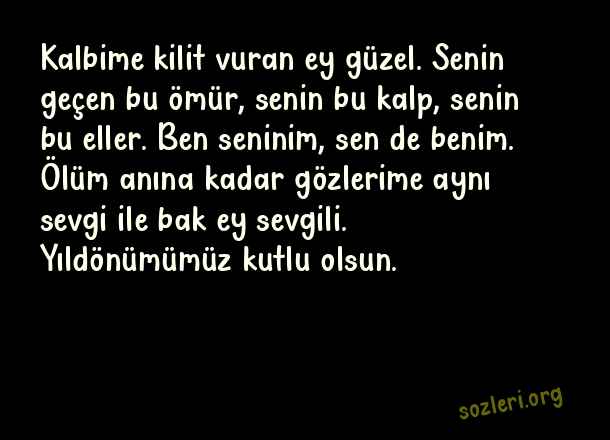 Kalbime kilit vuran ey güzel. Senin geçen bu ömür, senin bu kalp, senin bu eller. Ben seninim, sen de benim. Ölüm anına kadar gözlerime aynı sevgi ile bak ey sevgili. Yıldönümümüz kutlu olsun. ( Sevgiliye Yıldönümü )
