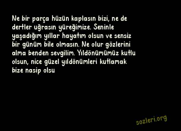 Ne bir parça hüzün kaplasın bizi, ne de dertler uğrasın yüreğimize. Seninle yaşadığım yıllar hayatım olsun ve sensiz bir günüm bile olmasın. Ne olur gözlerini alma benden sevgilim. Yıldönümümüz kutlu olsun, nice güzel yıldönümleri kutlamak bize nasip olsu ( Sevgiliye Yıldönümü )