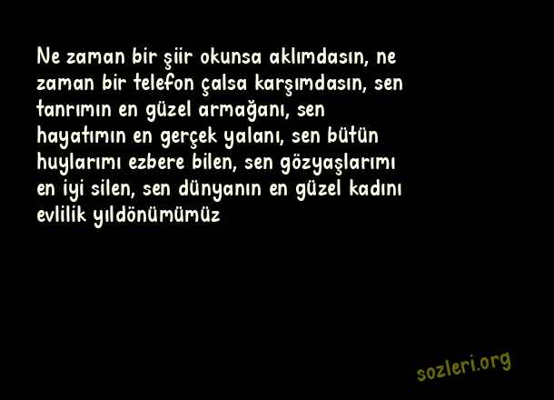 Ne zaman bir şiir okunsa aklımdasın, ne zaman bir telefon çalsa karşımdasın, sen tanrımın en güzel armağanı, sen hayatımın en gerçek yalanı, sen bütün huylarımı ezbere bilen, sen gözyaşlarımı en iyi silen, sen dünyanın en güzel kadını evlilik yıldönümümüz ( Evlilik Yıldönümü )