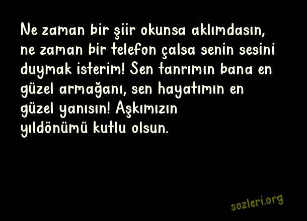Ne zaman bir şiir okunsa aklımdasın, ne zaman bir telefon çalsa senin sesini duymak isterim! Sen tanrımın bana en güzel armağanı, sen hayatımın en güzel yanısın! Aşkımızın yıldönümü kutlu olsun. ( Yıldönümü )