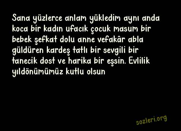 Sana yüzlerce anlam yükledim aynı anda koca bir kadın ufacık çocuk masum bir bebek şefkat dolu anne vefakâr abla güldüren kardeş tatlı bir sevgili bir tanecik dost ve harika bir eşsin. Evlilik yıldönümümüz kutlu olsun… ( Evlilik Yıldönümü )
