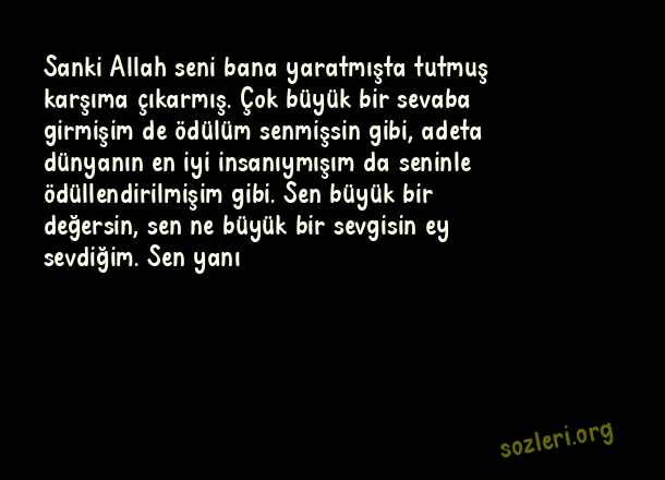 Sanki Allah seni bana yaratmışta tutmuş karşıma çıkarmış. Çok büyük bir sevaba girmişim de ödülüm senmişsin gibi, adeta dünyanın en iyi insanıymışım da seninle ödüllendirilmişim gibi. Sen büyük bir değersin, sen ne büyük bir sevgisin ey sevdiğim. Sen yanı ( Sevgiliye Yıldönümü )