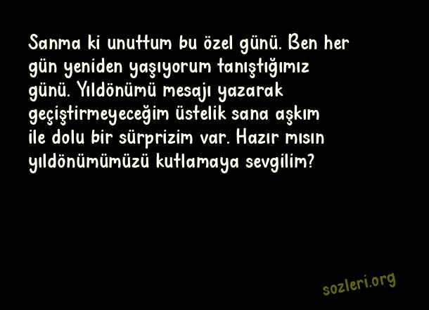 Sanma ki unuttum bu özel günü. Ben her gün yeniden yaşıyorum tanıştığımız günü. Yıldönümü mesajı yazarak geçiştirmeyeceğim üstelik sana aşkım ile dolu bir sürprizim var. Hazır mısın yıldönümümüzü kutlamaya sevgilim? ( Sevgiliye Yıldönümü )