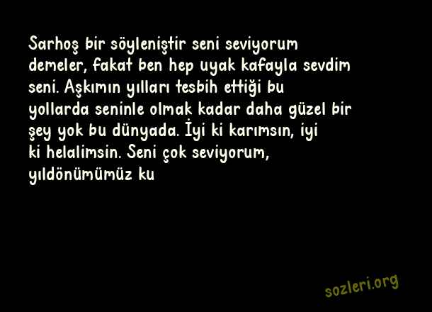 Sarhoş bir söyleniştir seni seviyorum demeler, fakat ben hep uyak kafayla sevdim seni. Aşkımın yılları tesbih ettiği bu yollarda seninle olmak kadar daha güzel bir şey yok bu dünyada. İyi ki karımsın, iyi ki helalimsin. Seni çok seviyorum, yıldönümümüz ku ( Yıldönümü )