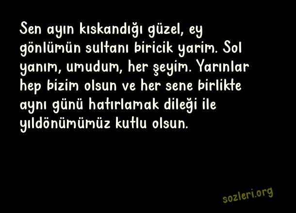 Sen ayın kıskandığı güzel, ey gönlümün sultanı biricik yarim. Sol yanım, umudum, her şeyim. Yarınlar hep bizim olsun ve her sene birlikte aynı günü hatırlamak dileği ile yıldönümümüz kutlu olsun. ( Yıldönümü )