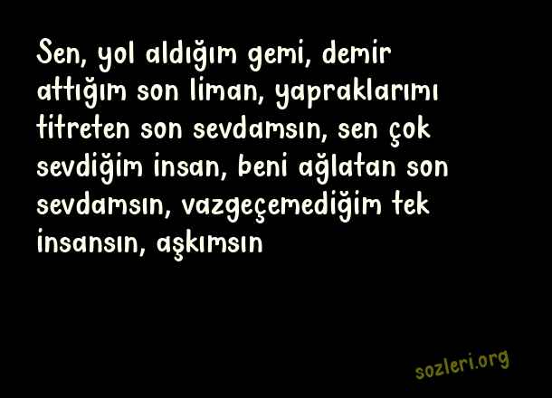 Sen, yol aldığım gemi, demir attığım son liman, yapraklarımı titreten son sevdamsın, sen çok sevdiğim insan, beni ağlatan son sevdamsın, vazgeçemediğim tek insansın, aşkımsın… ( Kocaya Evlilik Yıldönümü )