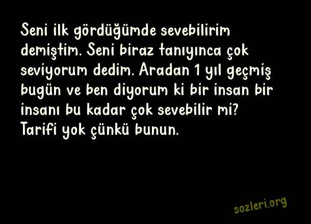 Seni ilk gördüğümde sevebilirim demiştim. Seni biraz tanıyınca çok seviyorum dedim. Aradan 1 yıl geçmiş bugün ve ben diyorum ki bir insan bir insanı bu kadar çok sevebilir mi? Tarifi yok çünkü bunun. ( Sevgiliye Yıldönümü )