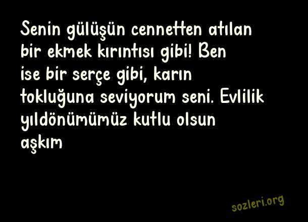 Senin gülüşün cennetten atılan bir ekmek kırıntısı gibi! Ben ise bir serçe gibi, karın tokluğuna seviyorum seni. Evlilik yıldönümümüz kutlu olsun aşkım… ( Kocaya Evlilik Yıldönümü )