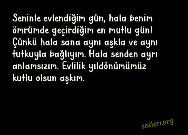 Seninle evlendiğim gün, hala benim ömrümde geçirdiğim en mutlu gün! Çünkü hala sana aynı aşkla ve aynı tutkuyla bağlıyım. Hala senden ayrı anlamsızım. Evlilik yıldönümümüz kutlu olsun aşkım. ( Yıldönümü )