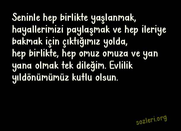 Seninle hep birlikte yaşlanmak, hayallerimizi paylaşmak ve hep ileriye bakmak için çıktığımız yolda, hep birlikte, hep omuz omuza ve yan yana olmak tek dileğim. Evlilik yıldönümümüz kutlu olsun. ( Evlilik Yıldönümü )