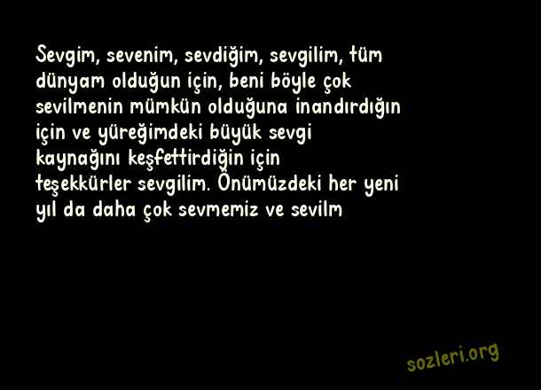 Sevgim, sevenim, sevdiğim, sevgilim, tüm dünyam olduğun için, beni böyle çok sevilmenin mümkün olduğuna inandırdığın için ve yüreğimdeki büyük sevgi kaynağını keşfettirdiğin için teşekkürler sevgilim. Önümüzdeki her yeni yıl da daha çok sevmemiz ve sevilm ( Sevgiliye Yıldönümü )