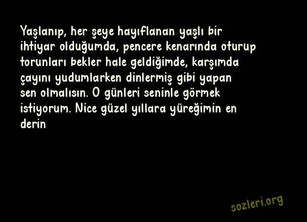 Yaşlanıp, her şeye hayıflanan yaşlı bir ihtiyar olduğumda, pencere kenarında oturup torunları bekler hale geldiğimde, karşımda çayını yudumlarken dinlermiş gibi yapan sen olmalısın. O günleri seninle görmek istiyorum. Nice güzel yıllara yüreğimin en derin ( Sevgiliye Yıldönümü )