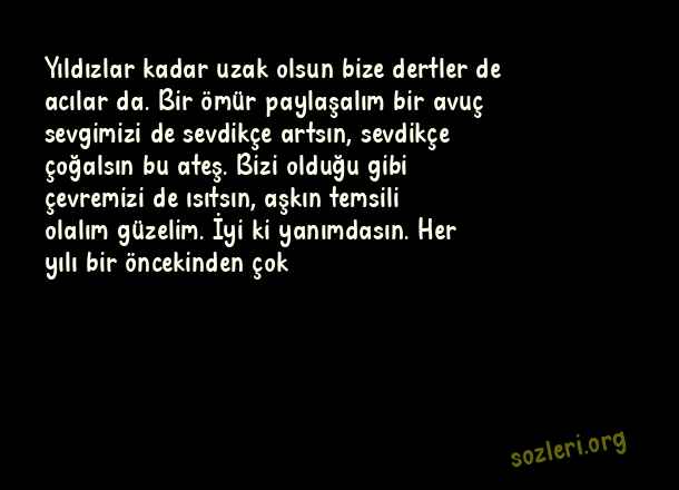 Yıldızlar kadar uzak olsun bize dertler de acılar da. Bir ömür paylaşalım bir avuç sevgimizi de sevdikçe artsın, sevdikçe çoğalsın bu ateş. Bizi olduğu gibi çevremizi de ısıtsın, aşkın temsili olalım güzelim. İyi ki yanımdasın. Her yılı bir öncekinden çok ( Sevgiliye Yıldönümü )