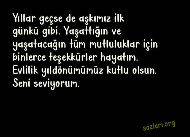 Yıllar geçse de aşkımız ilk günkü gibi. Yaşattığın ve yaşatacağın tüm mutluluklar için binlerce teşekkürler hayatım. Evlilik yıldönümümüz kutlu olsun. Seni seviyorum. ( Evlilik Yıldönümü )