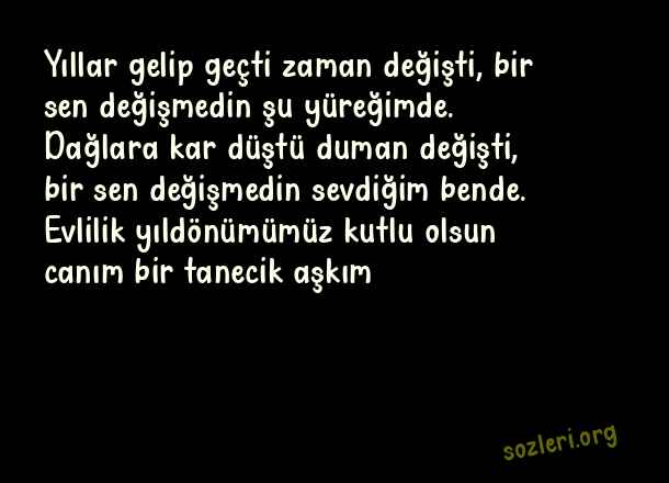 Yıllar gelip geçti zaman değişti, bir sen değişmedin şu yüreğimde. Dağlara kar düştü duman değişti, bir sen değişmedin sevdiğim bende. Evlilik yıldönümümüz kutlu olsun canım bir tanecik aşkım… ( Kocaya Evlilik Yıldönümü )