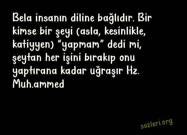 Bela insanın diline bağlıdır. Bir kimse bir şeyi (asla, kesinlikle, katiyyen) “yapmam” dedi mi, şeytan her işini bırakıp onu yaptırana kadar uğraşır Hz. Muh.ammed ( Büyük Konuşmak )