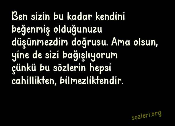 Ben sizin bu kadar kendini beğenmiş olduğunuzu düşünmezdim doğrusu. Ama olsun, yine de sizi bağışlıyorum çünkü bu sözlerin hepsi cahillikten, bilmezliktendir. ( Kendini Büyük Görmek )