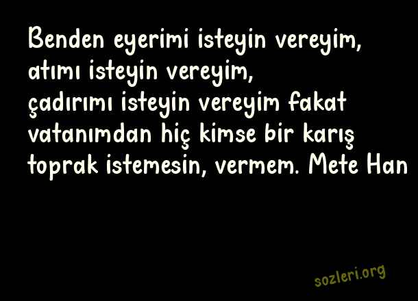 Benden eyerimi isteyin vereyim, atımı isteyin vereyim, çadırımı isteyin vereyim fakat vatanımdan hiç kimse bir karış toprak istemesin, vermem. Mete Han ( Türk Büyüklerinin )