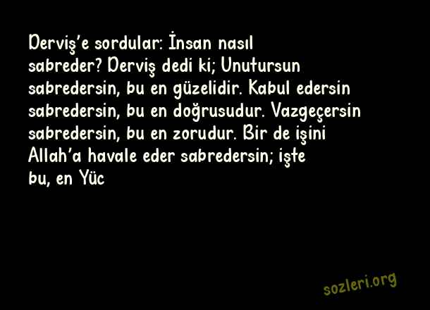 Derviş’e sordular: İnsan nasıl sabreder? Derviş dedi ki; Unutursun sabredersin, bu en güzelidir. Kabul edersin sabredersin, bu en doğrusudur. Vazgeçersin sabredersin, bu en zorudur. Bir de işini Allah’a havale eder sabredersin; işte bu, en Yüc ( Allah Büyük )