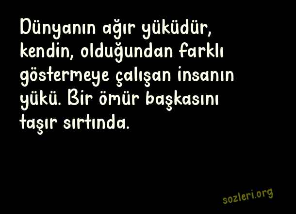 Dünyanın ağır yüküdür, kendin, olduğundan farklı göstermeye çalışan insanın yükü. Bir ömür başkasını taşır sırtında. ( Yük )