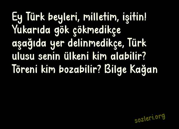 Ey Türk beyleri, milletim, işitin! Yukarıda gök çökmedikçe aşağıda yer delinmedikçe, Türk ulusu senin ülkeni kim alabilir? Töreni kim bozabilir? Bilge Kağan ( Türk Büyüklerinin )