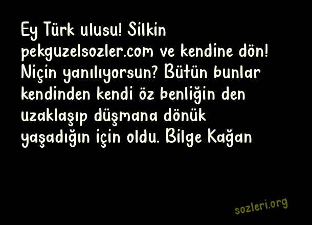 Ey Türk ulusu! Silkin ve kendine dön! Niçin yanılıyorsun? Bütün bunlar kendinden kendi öz benliğin den uzaklaşıp düşmana dönük yaşadığın için oldu. Bilge Kağan ( Türk Büyüklerinin )