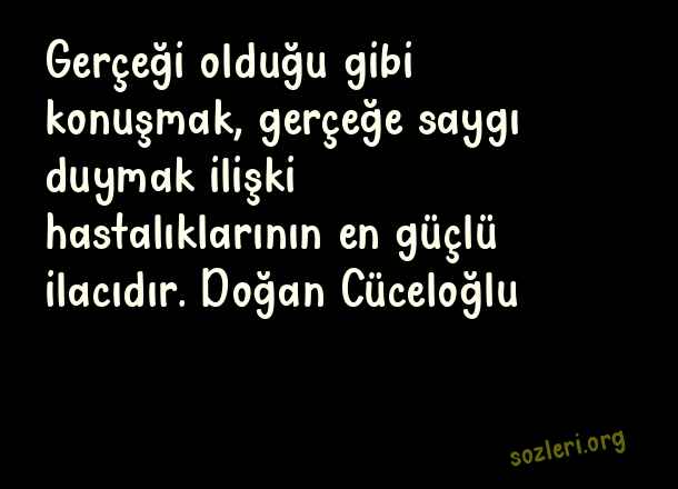 Gerçeği olduğu gibi konuşmak, gerçeğe saygı duymak ilişki hastalıklarının en güçlü ilacıdır. Doğan Cüceloğlu ( Büyük Konuşmak )