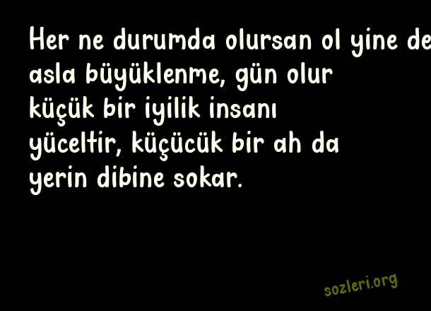 Her ne durumda olursan ol yine de asla büyüklenme, gün olur küçük bir iyilik insanı yüceltir, küçücük bir ah da yerin dibine sokar. ( Kendini Büyük Görmek )