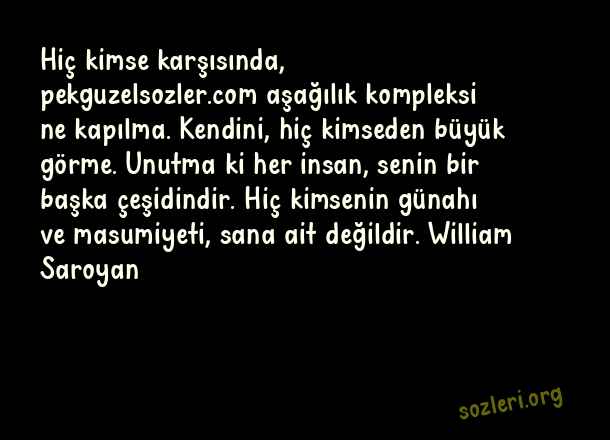 Hiç kimse karşısında, aşağılık kompleksi ne kapılma. Kendini, hiç kimseden büyük görme. Unutma ki her insan, senin bir başka çeşidindir. Hiç kimsenin günahı ve masumiyeti, sana ait değildir. William Saroyan ( Kendini Büyük Görmek )