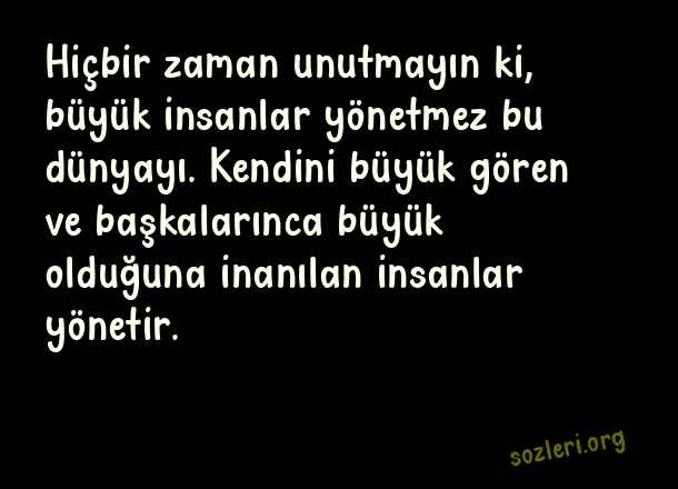 Hiçbir zaman unutmayın ki, büyük insanlar yönetmez bu dünyayı. Kendini büyük gören ve başkalarınca büyük olduğuna inanılan insanlar yönetir. ( Kendini Büyük Görmek )