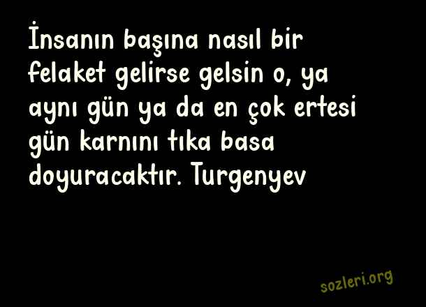 İnsanın başına nasıl bir felaket gelirse gelsin o, ya aynı gün ya da en çok ertesi gün karnını tıka basa doyuracaktır. Turgenyev ( Büyük Sözler )