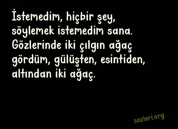 İstemedim, hiçbir şey, söylemek istemedim sana. Gözlerinde iki çılgın ağaç gördüm, gülüşten, esintiden, altından iki ağaç. ( Büyük Aşk )
