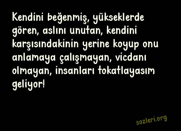 Kendini beğenmiş, yükseklerde gören, aslını unutan, kendini karşısındakinin yerine koyup onu anlamaya çalışmayan, vicdanı olmayan, insanları tokatlayasım geliyor! ( Kendini Büyük Görmek )
