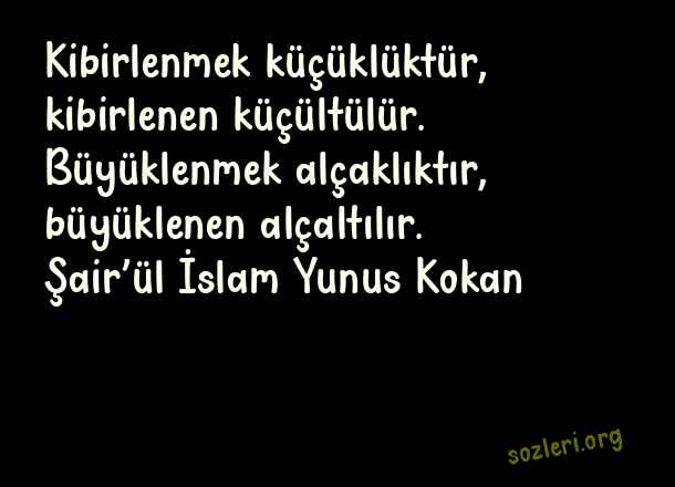 Kibirlenmek küçüklüktür, kibirlenen küçültülür. Büyüklenmek alçaklıktır, büyüklenen alçaltılır. Şair’ül İslam Yunus Kokan ( Kendini Büyük Görmek )