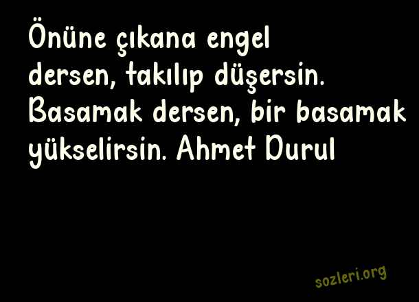 Önüne çıkana engel dersen, takılıp düşersin. Basamak dersen, bir basamak yükselirsin. Ahmet Durul ( Yükselmek )