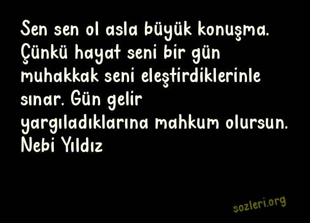 Sen sen ol asla büyük konuşma. Çünkü hayat seni bir gün muhakkak seni eleştirdiklerinle sınar. Gün gelir yargıladıklarına mahkum olursun. Nebi Yıldız ( Büyük Konuşmak )