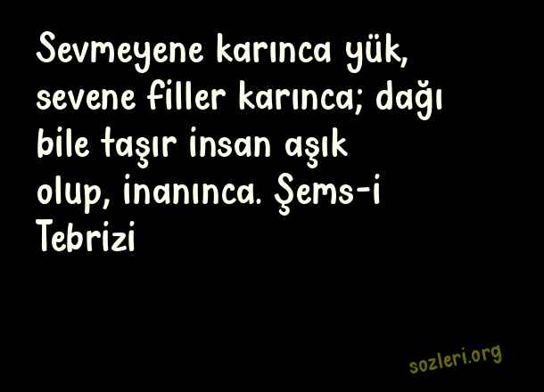 Sevmeyene karınca yük, sevene filler karınca; dağı bile taşır insan aşık olup, inanınca. Şems-i Tebrizi ( Yük )