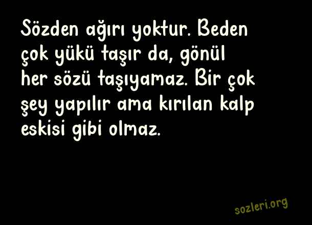 Sözden ağırı yoktur. Beden çok yükü taşır da, gönül her sözü taşıyamaz. Bir çok şey yapılır ama kırılan kalp eskisi gibi olmaz. ( Yük )